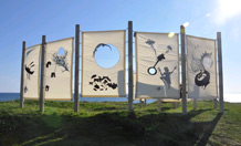 Displayed on Fisherman’s Green next to the beach, Storyweir is a kind of sundial incorporating silhouettes of things remembered and imagined and stories told that are or might one day become the folklore or fossils that explain the ancient history of the site.
