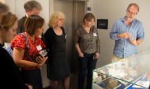 Dr Phil Wickham, Curator of The Bill Douglas Cinema Museum, shows the display to workshop participants.