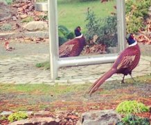Lonely pheasant takes up residence in mirror sculpture, to marvel at his own reflection